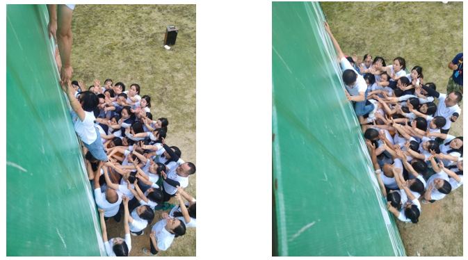 四米的高墙,在没有任何工具的帮助下,如何翻越?这是一场勇气的较量。一开始,四米高的墙令同学们望而生畏,于是,他们互相鼓励,用身体铸成了保护队员的基底,他们用肩膀,护送了一位又一位队友,此刻,他们都是英雄!