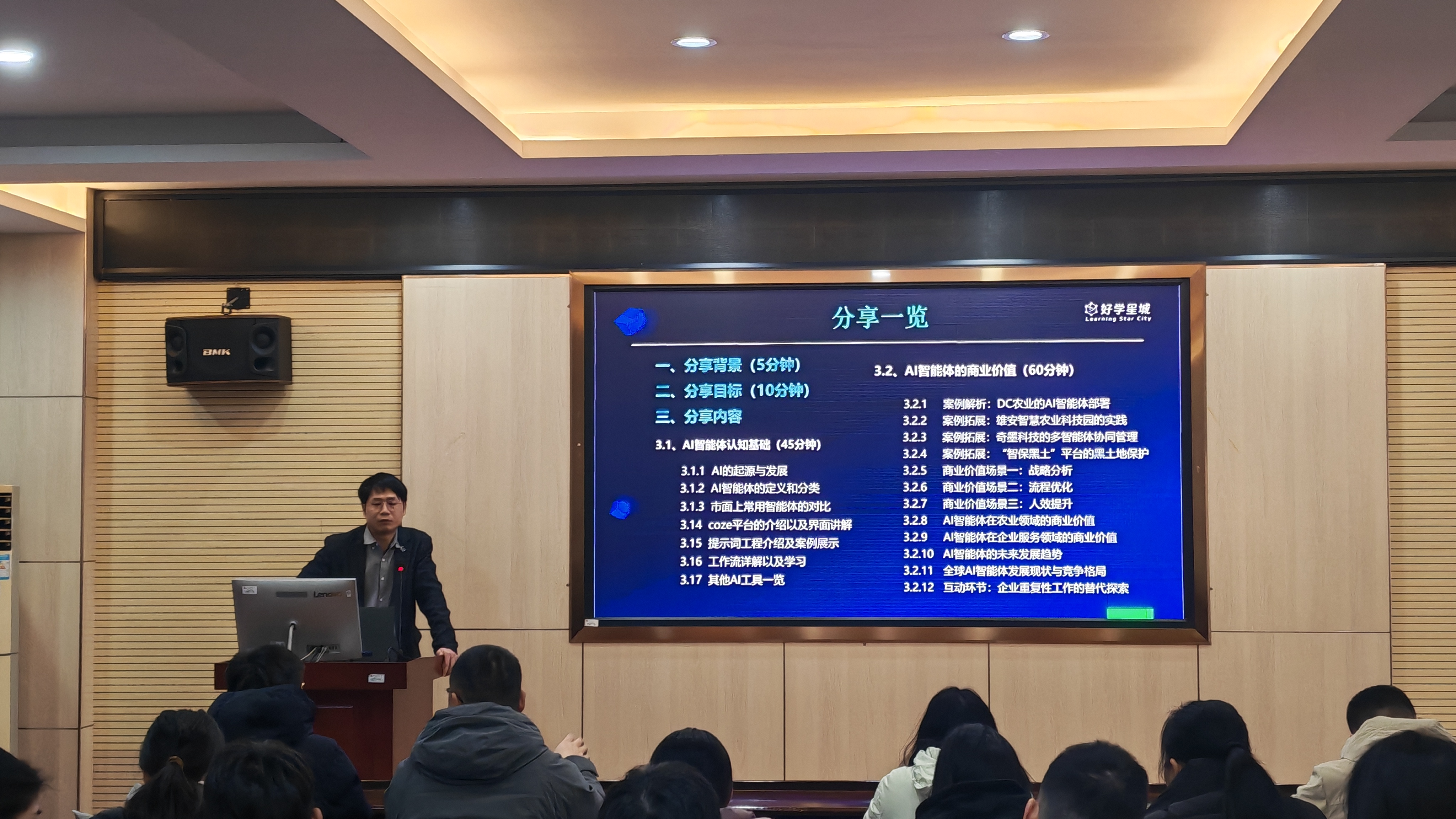 作者: 来源: 审稿: 浏览次数:次为助力MBA学员紧跟AI技术发展浪潮,提升技术赋能商业决策的实战能力,1月10日上午,湖南农业大学MBA中心特邀湖南杰越信息董事长傅湘平(Pack)先生做客“商道致用”大讲堂。在十教北103会议室,傅湘平先生为2025级MBA学员带来“AI智能体赋能商业决策”专题讲座,聚焦AI智能体核心价值与实战应用,为各行业管理者搭建起技术与商业深度融合的交流平台。